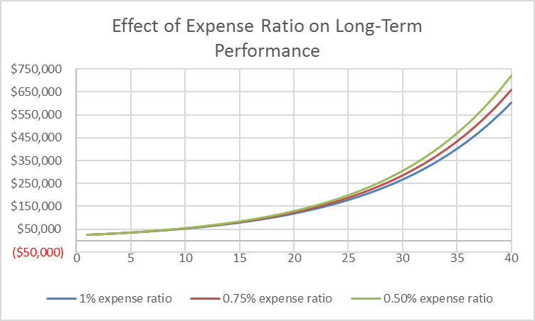 Consider two mutual funds -- one has an expense ratio of 0.5% and the other has an expense ratio of 0.75%. Both funds track the S&P 500, which has historically produced returns of about 9.5% per year. If you were to invest $25,000 in each of these funds and leave your investment alone for 30 years, how big of a difference do you think a quarter-percent difference in expense ratio could make?