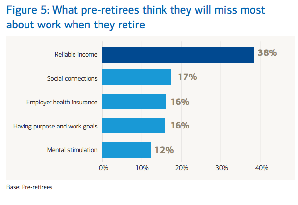 Before rolling your eyes, hear me out. In 2013, Merrill Lynch and Age Wave (MLAW) conducted a study asking pre-retirees what they would "miss most about work when they retire." By an enormous margin, "a reliable income" was the most popular answer.