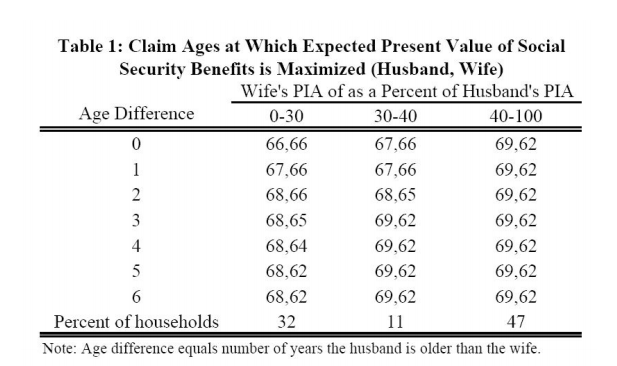 Researchers calculated when the husband and wife should claim, based on their age difference up to six years, and based on three subsets of the wife's PIA: from 0% to 30% of the husband's, from 30% to 40% of the husband's, and between 40% and 100% of the husband's.