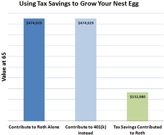 If you take the amount that you'd normally contribute to a Roth (the maximum for those aged 49 and younger in 2015 is $5,500) and instead increase your contributions to your 401(k), you'll reduce your taxes each year. If you pay 28% in federal taxes, that's $1,540 more you'll take home this year. Instead of taking it home, though, put that in your Roth. If you were to start doing this at 40 and keep it up until 65, you'd end up with nearly $133,000 more, based on an 8% annualized rate of return: