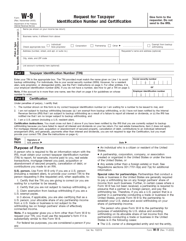 The W9 form -- Request for Taxpayer Identification Number and Certification -- is an IRS form, but not one you send to the IRS. Instead, you typically get one from a business that will be paying you, and its purpose is to record your tax identification number, along with your name and address. That's so the business can later fill out paperwork for the IRS, such as a 1099 form, reporting how much it has paid you. The number is necessary to ensure the IRS can identify you and connect the reported income with the correct person or business.